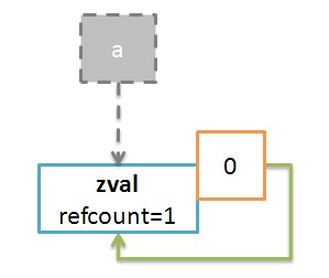 这段代码首先建立了数组a,然后让a的第一个元素按引用指向a,这时a的zval的refcount就变为2,然后我们销毁变量a,此时a最初指向的zval的refcount为1,但是我们再也没有办法对其进行操作,因为其形成了一个循环自引用,如下图所示:
